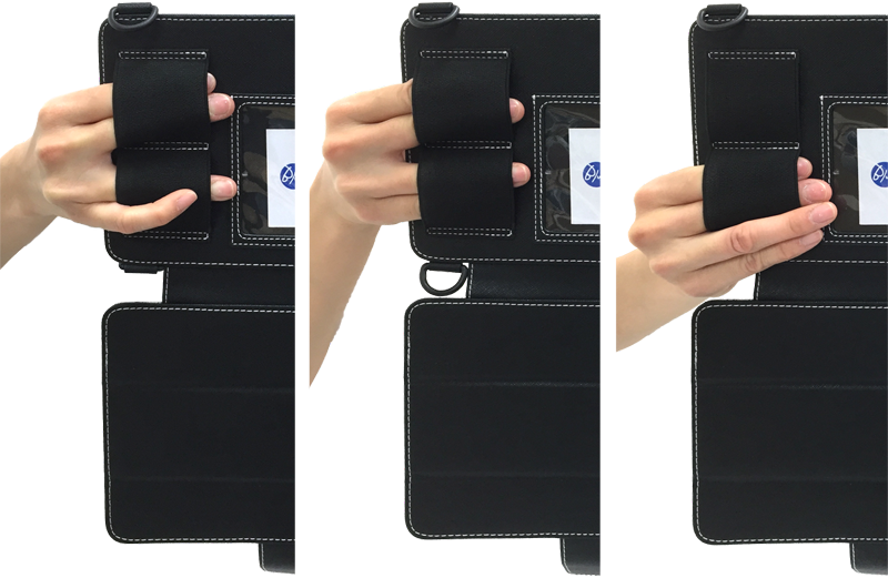 iPad miniのカメラアプリを使用している時、どうしても片手でシャッターを切りたい時ってないですか?普通に持っていてはなかなか難しいですね。そんな時、背面の片手シャッターベルトに指を通せば片手でシャッターを切ることができます。仕事現場での指差写真や、自撮りに、これは便利です。