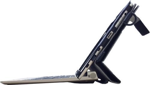 デスクで使用する時は、フラップを三角にまとめてスタンド型へ。打ち合わせの時は、フラップを一枚だけ起こして少しだけ画面を傾ける。という風に画面を見やすい角度に2段階調整する事ができます。