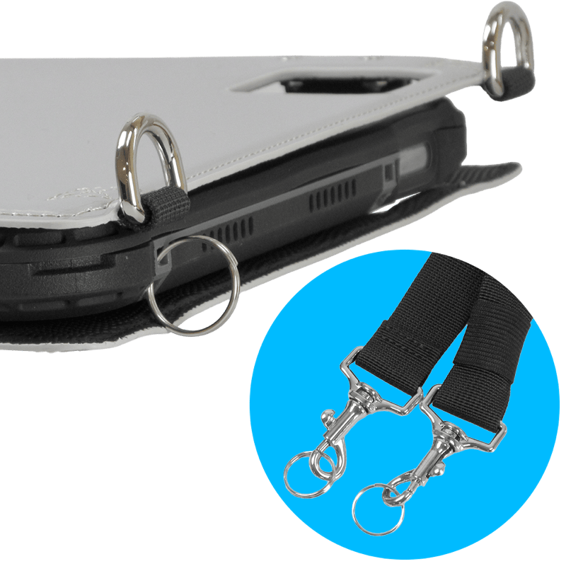 長さを調節できるネックストラップのフックと、カバーのDカンには金属製パーツを採用。屋外での使用や持ち運び時も、しっかりとした強度で安心してご利用いただけます。