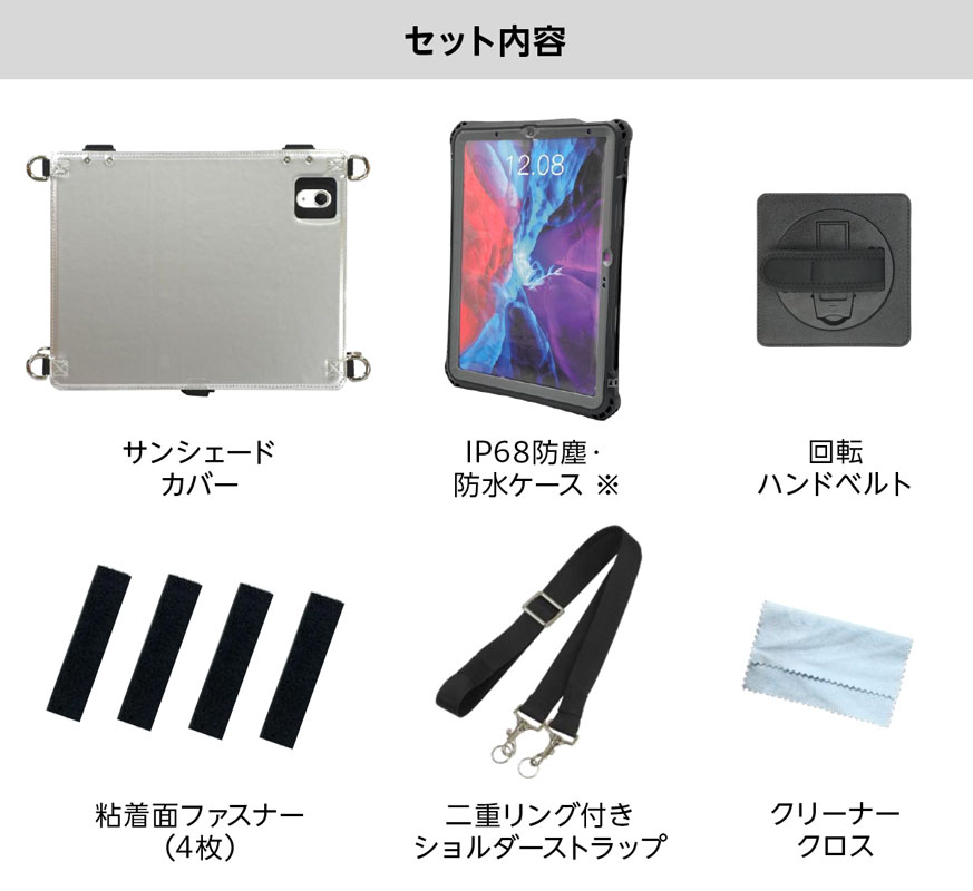 iPad用のIP68防塵・防水ケースに粘着剤付きのメステープを貼り付けた上で、サンシェードカバーに装着する仕様です。そのため、ケースは付属品として必要となります。