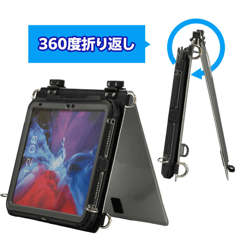 画面カバーは360度折り返すことができ、スタンドとしても使用可能です。角度調整や設置がしやすく、屋外でも快適にご使用いただけます。