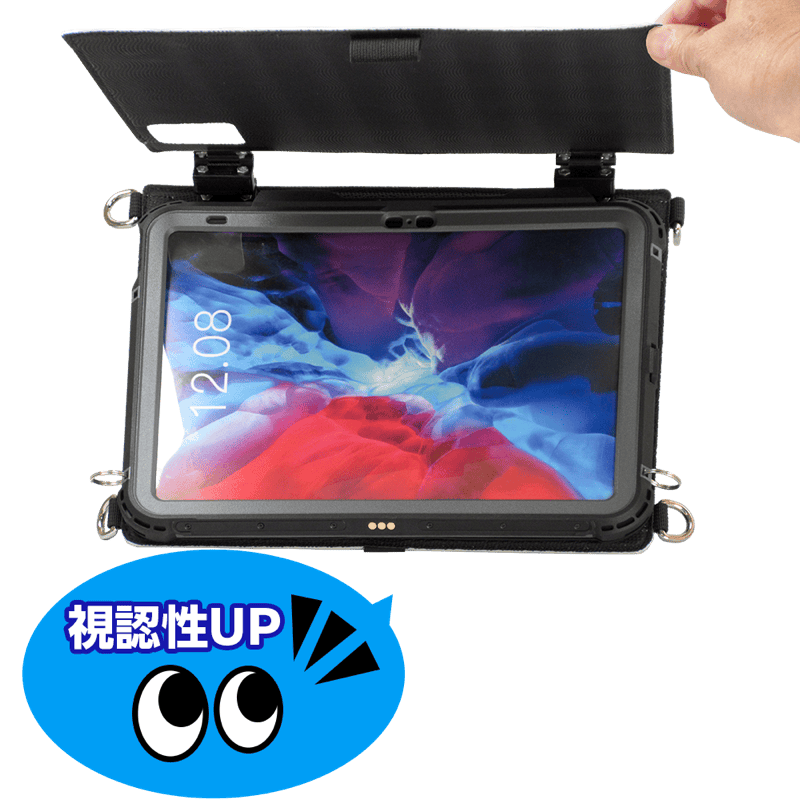 夏の屋外での直射日光によるタブレットの温度上昇と画面反射を防止する、11インチのiPad向けのカバーです。屋外作業の作業効率改善にオススメです。対応機種ごとに専用のセットをご用意しています。意匠登録済の商品です。